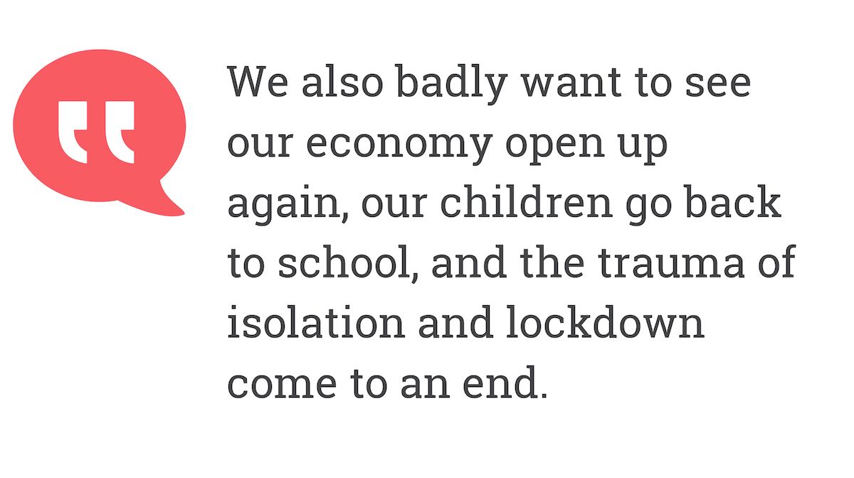 We also badly want to see our economy open up again, our children go back to school, and the trauma of isolation and lockdown come to an end.