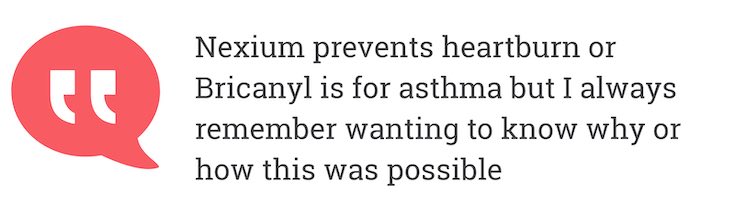 As a young teenager I only had the capacity to grasp the basic concepts. Nexium prevents heartburn or Bricanyl is for asthma but I always remember wanting to know why or how this was possible.