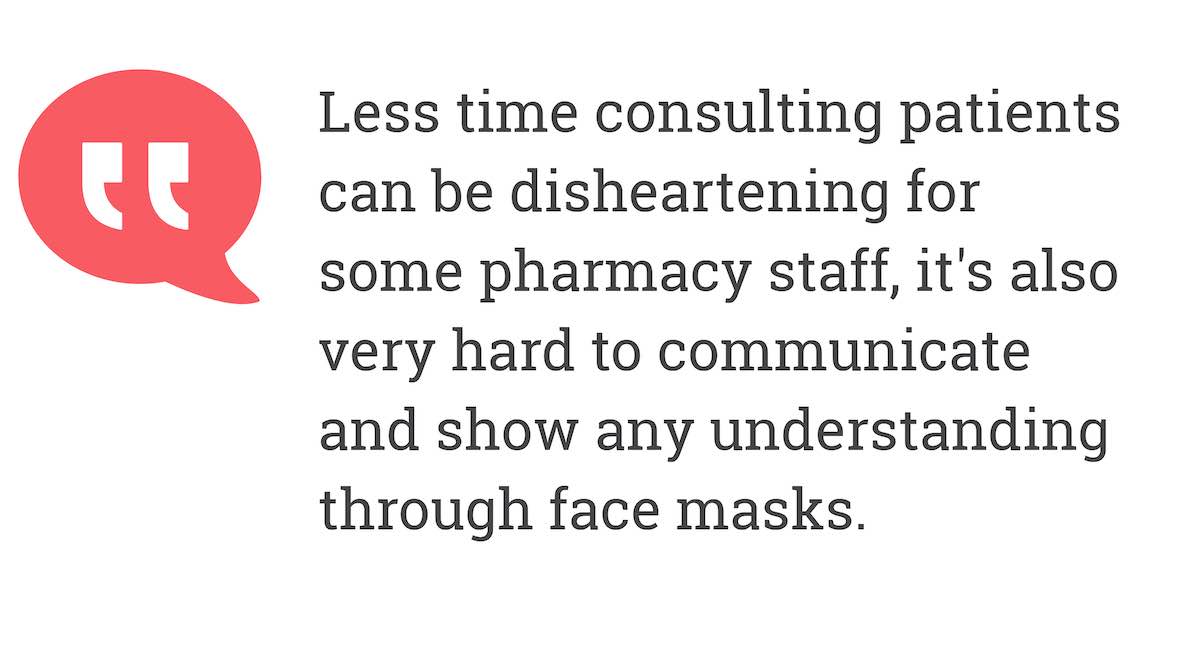 - Less time consulting patients can be disheartening for some Pharmacy staff, it's also very hard to communicate and show any understanding through face masks.