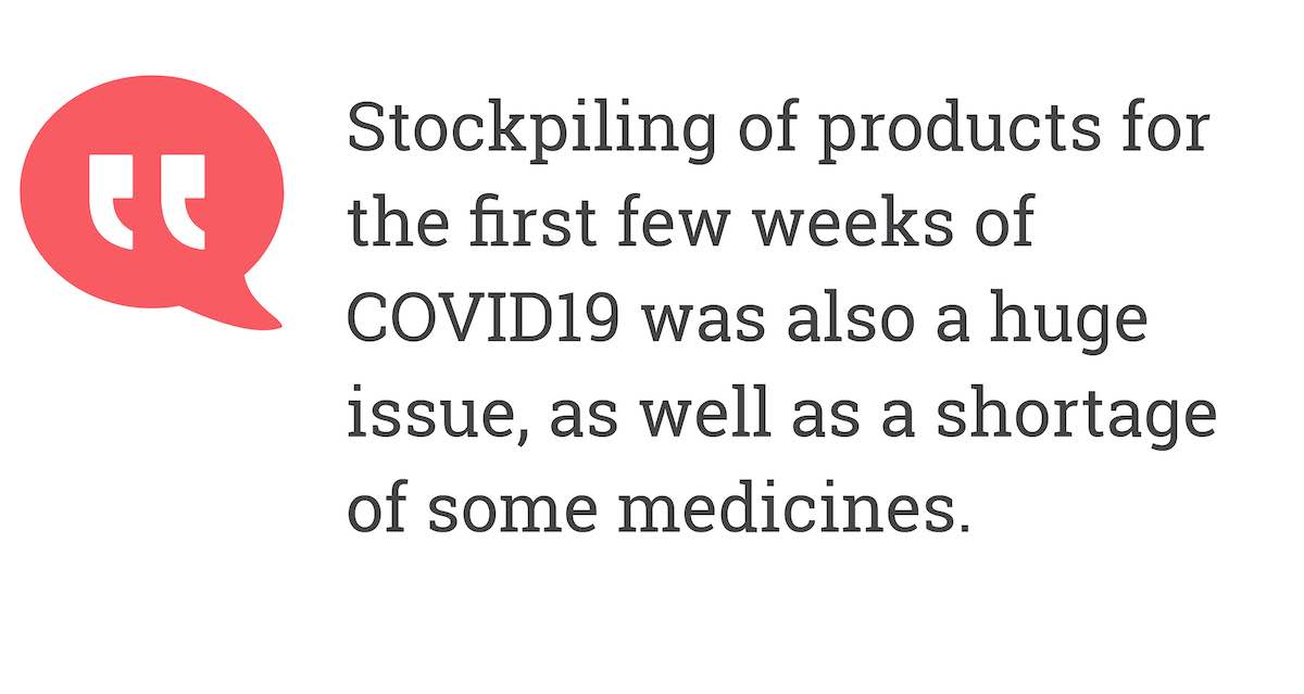 - Stockpiling of products for the first few weeks of COVID19 was also a huge issue, as well as a shortage of some medicines.