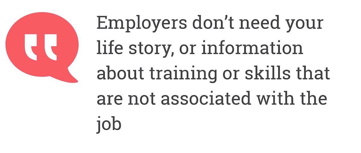 Employers don’t need your life story, or information about training or skills that are not associated with the job.