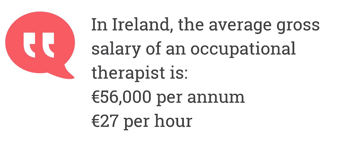 In Ireland, the average gross salary of an Occupational Therapist is around €56,000 or €27 per hour.