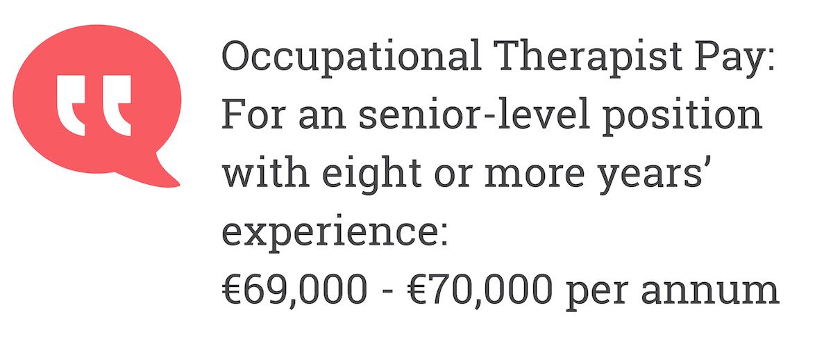 In Ireland, the average gross salary of an Occupational Therapist is around €56,000 or €27 per hour.This article outlines the salary can you expect as an Occupational Therapist in Ireland. We cover HSE pay scales as well as a brief outline of the role and how you can become one.