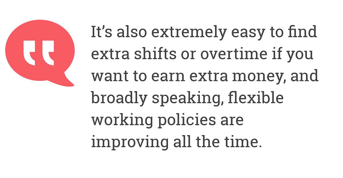 It’s also extremely easy to find extra shifts or overtime if you want to earn extra money, and broadly speaking, flexible working policies are improving all the time.