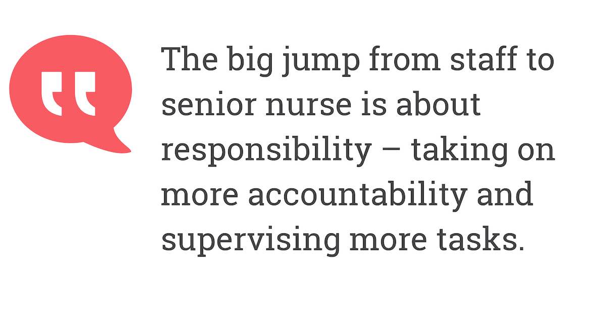 The big jump from Staff to Senior Nurse is about responsibility – taking on more accountability and supervising more tasks.